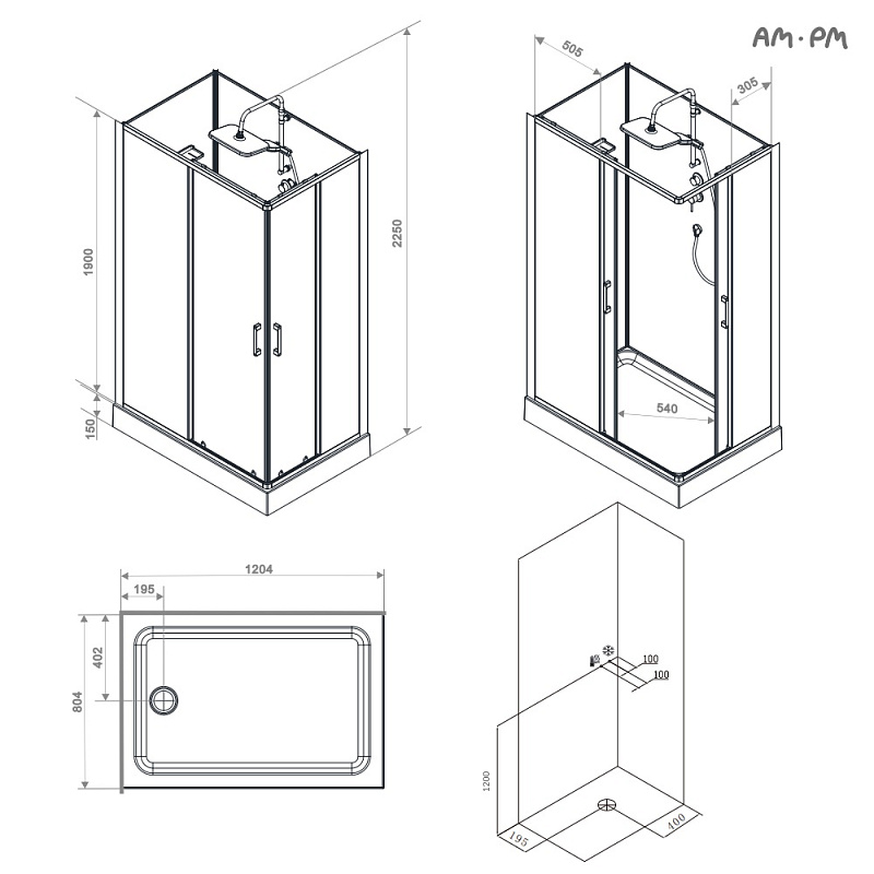 Душевая кабина бренда AM.PM коллекции Above без крыши с верхним тропическим душем представляет стильное решение для вашей ванной комнаты. Душевая кабина отлично впишется в ваш интерьер. Форма кабины - прямоугольная. Цвет профиля - черный матовый. Размер (Ш/Г/В): 804x1204x2250 мм. Высота поддона - 150 мм. Материал задних стенок - стекло. Материал дверок - прозрачное стекло. Толщина стекла - 4 мм.