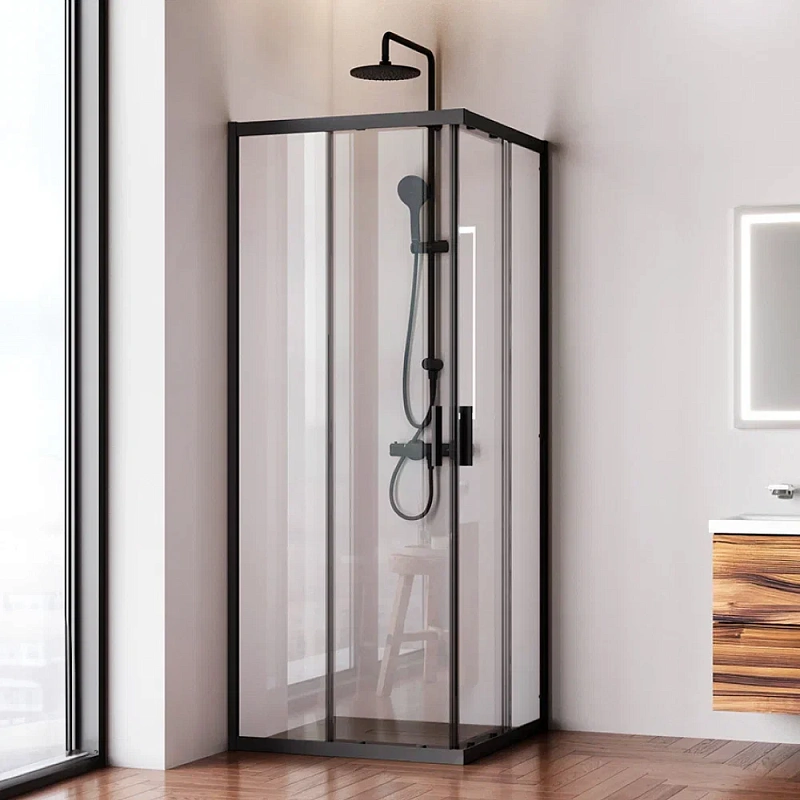 Идеальное сочетание профилей. Надежная фурнитура в цвет профиля – тотально черный от бренда AM.PM из коллекции Gem. Цвет профиля - черный матовый. Размер (Ш/Г/В): 800x800x1950 мм. Материал ограждения - прозрачное стекло; алюминий. Толщина стекла - 6 мм. Форма - квадратная.