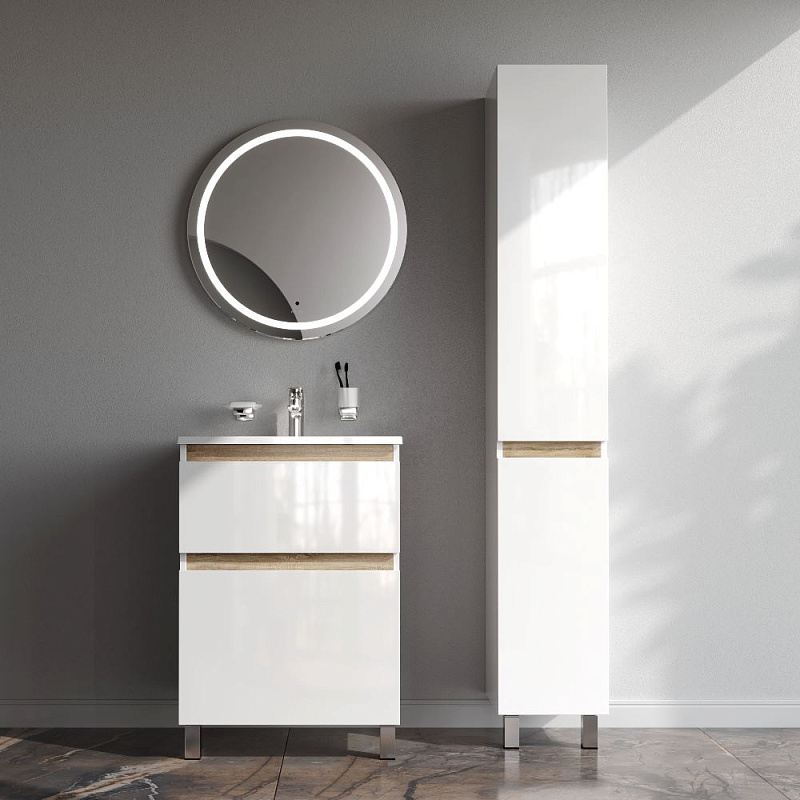 Добавьте в комплект напольный правый шкаф-пенал с белыми глянцевыми фасадами, дополненными отделкой под светлое дерево. Размер шкафа-пенала (Ш/Г/В): 300x320x1900 мм.