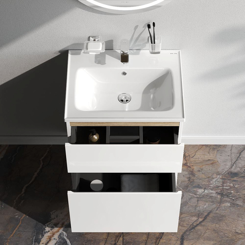 Напольная тумба бренда AM.PM коллекции X-Joy с белыми глянцевыми фасадами, дополненными отделкой под светлое дерево. Функциональный органайзер в первом ящике позволит хранить необходимые косметические средства под рукой и в полном порядке. Внутреннее покрытие каждого ящика выполнено в современном цвете "антрацит" и имеет противоскользящее покрытие. Размер тумбы (Ш/Г/В): 575x445x830 мм.