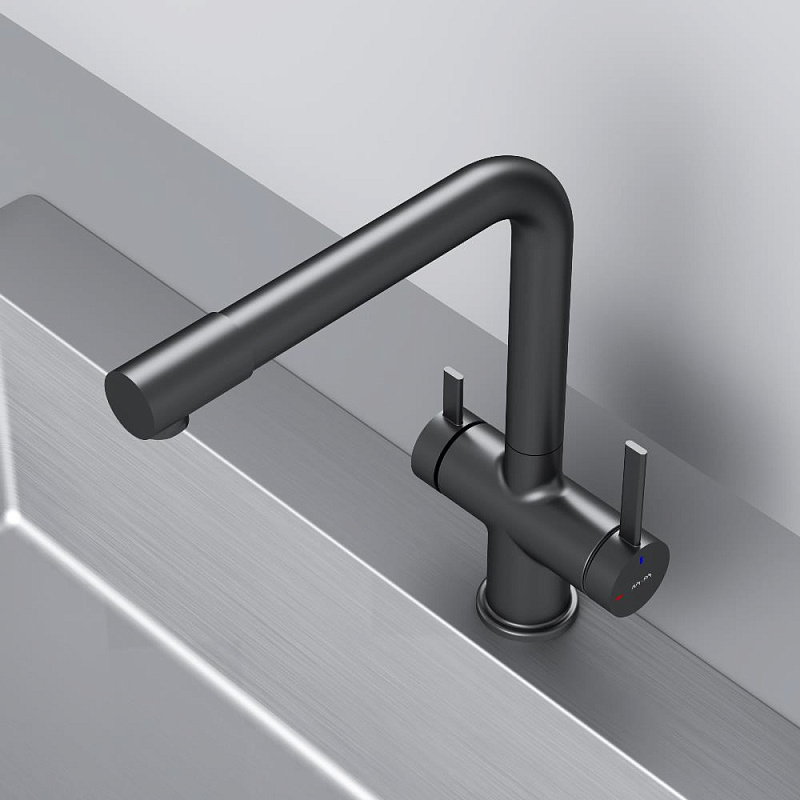Встречайте долгожданное пополнение нашумевшей коллекции Func — кухонные смесители с оригинальными «фишками», характерными для всей коллекции. Дизайн, характерный только для премиум-сегмента, благодаря собственным дизайнерам бренда теперь представлен и в более доступной ценовой категории. Смеситель оснащён встроенным каналом для подачи питьевой воды. Чтобы получить питьевую воду, воспользуйтесь ручкой, расположенной с левой стороны корпуса; для обычной воды управляйте смесителем привычным образом. Размер (Ш/Г/В): 135x265x298 мм. Материал - нержавеющая сталь, цинк, латунь. Цвет - черный. Тип управления - однозахватный. Излив - поворотный.