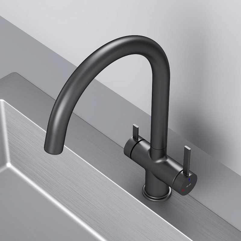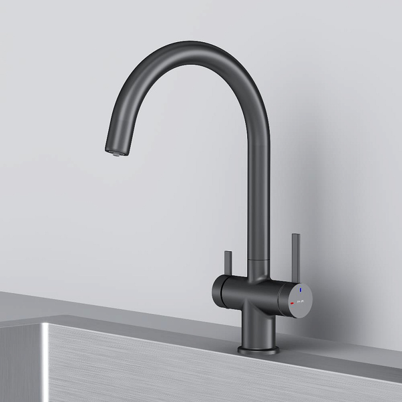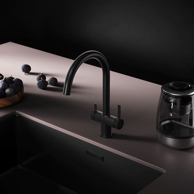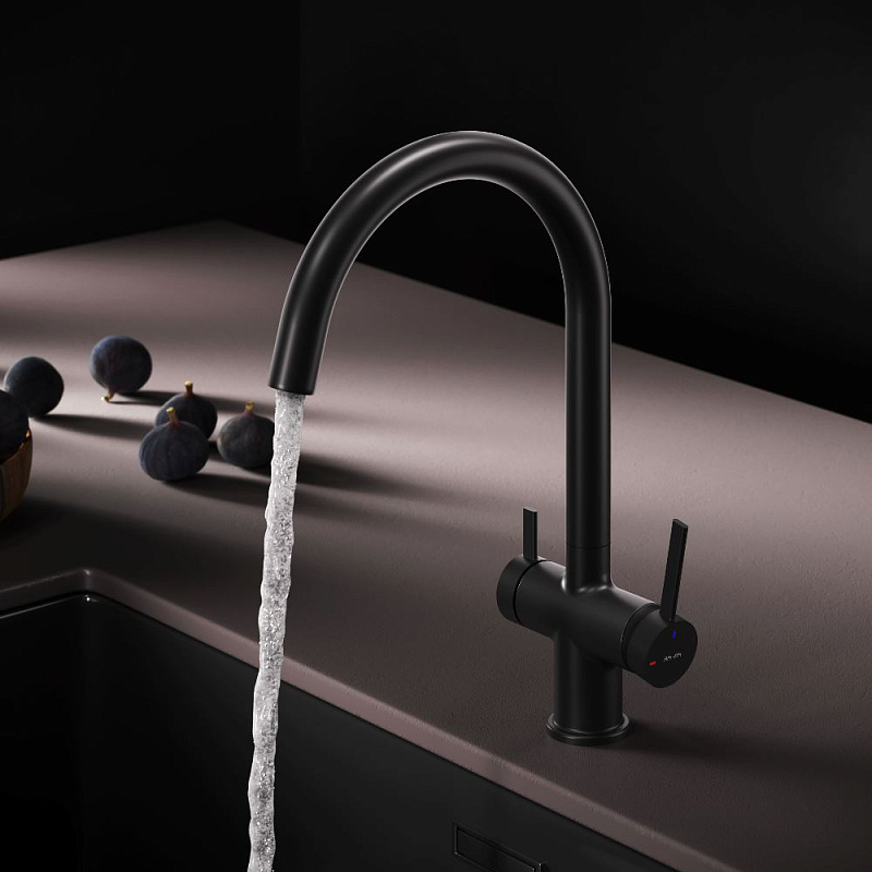 Встречайте долгожданное пополнение нашумевшей коллекции Func — кухонные смесители с оригинальными «фишками», характерными для всей коллекции. Дизайн, характерный только для премиум-сегмента, благодаря собственным дизайнерам бренда теперь представлен и в более доступной ценовой категории. Смеситель оснащён встроенным каналом для подачи питьевой воды. Чтобы получить питьевую воду, воспользуйтесь ручкой, расположенной с левой стороны корпуса; для обычной воды управляйте смесителем привычным образом. Размер (Ш/Г/В): 135x263x380 мм. Материал - нержавеющая сталь, цинк, латунь. Цвет - черный. Тип управления - однозахватный. Излив - поворотный.