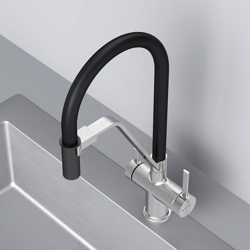 Смесители Смеситель для кухни AM.PM Func F8F07812 высокий, сатин с каналом для питьевой воды и гибким черным изливом купить в Москве.